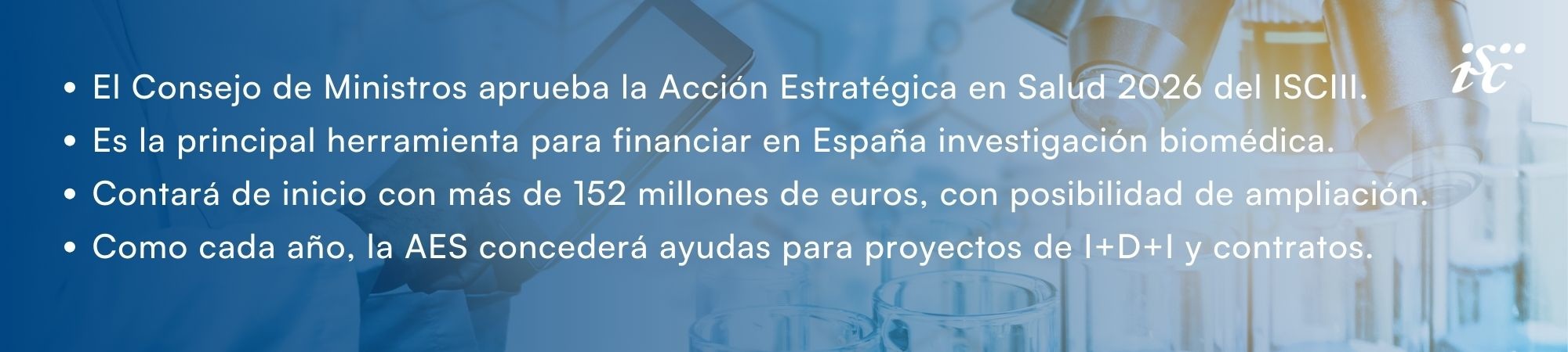 El Consejo de Ministros ha aprobado este martes 16 de diciembre la autorización al Instituto de Salud Carlos III (ISCIII) de la convocatoria 2026 de la Acción Estratégica en Salud (AES). La AES es la principal herramienta para financiar en España investigación biomédica y sanitaria, y está gestionada por el ISCIII como organismo público de investigación y agencia financiadora dependiente del Ministerio de Ciencia, Innovación y Universidades.