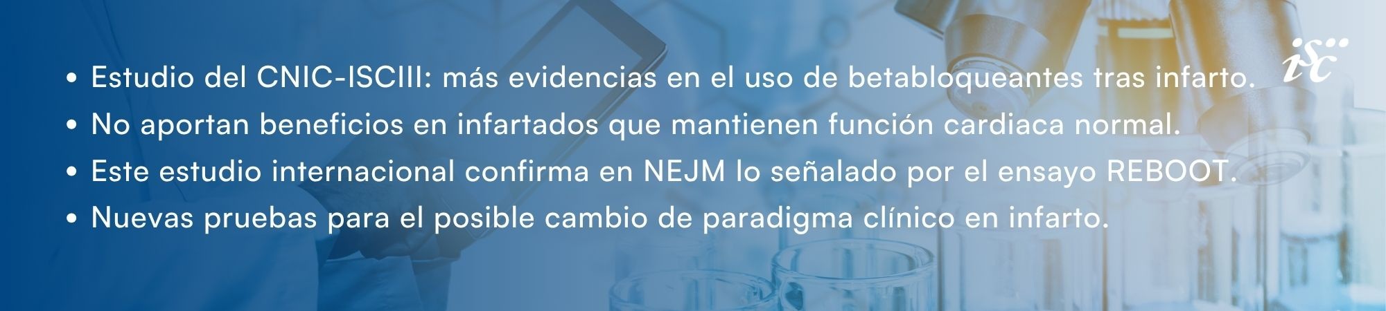 El estudio se ha publicado en la revista The New England Journal of Medicine (NEJM) y se presenta en el Congreso de la Asociación Americana del Corazón (AHA) en Nueva Orleans (EEUU). Los resultados reafirman las conclusiones del ensayo REBOOT, también liderado desde el CNIC-ISCIII; los betabloqueantes, uno de los tratamientos más extendidos tras un infarto agudo de miocardio, no reducen el riesgo de muerte, de nuevos infartos o de insuficiencia cardiaca en aquellos pacientes cuya función contráctil del corazón es normal.